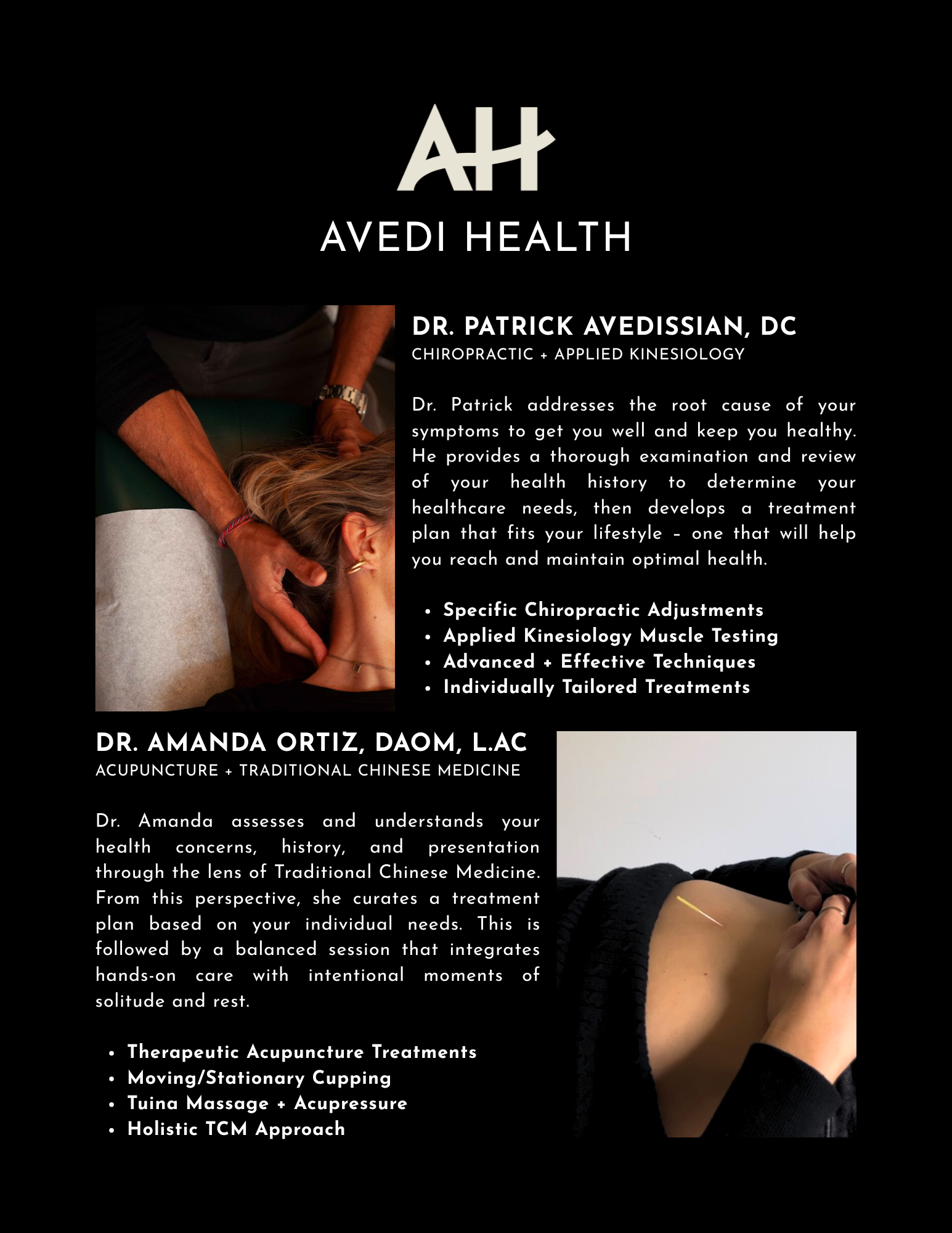 Led by Dr. Patrick Avedissian, chiropractor and applied kinesiologist, and acupuncturist, Dr. Amanda Ortiz, our practitioners work together to provide patient-centered care that supports your journey toward lasting health and vitality.